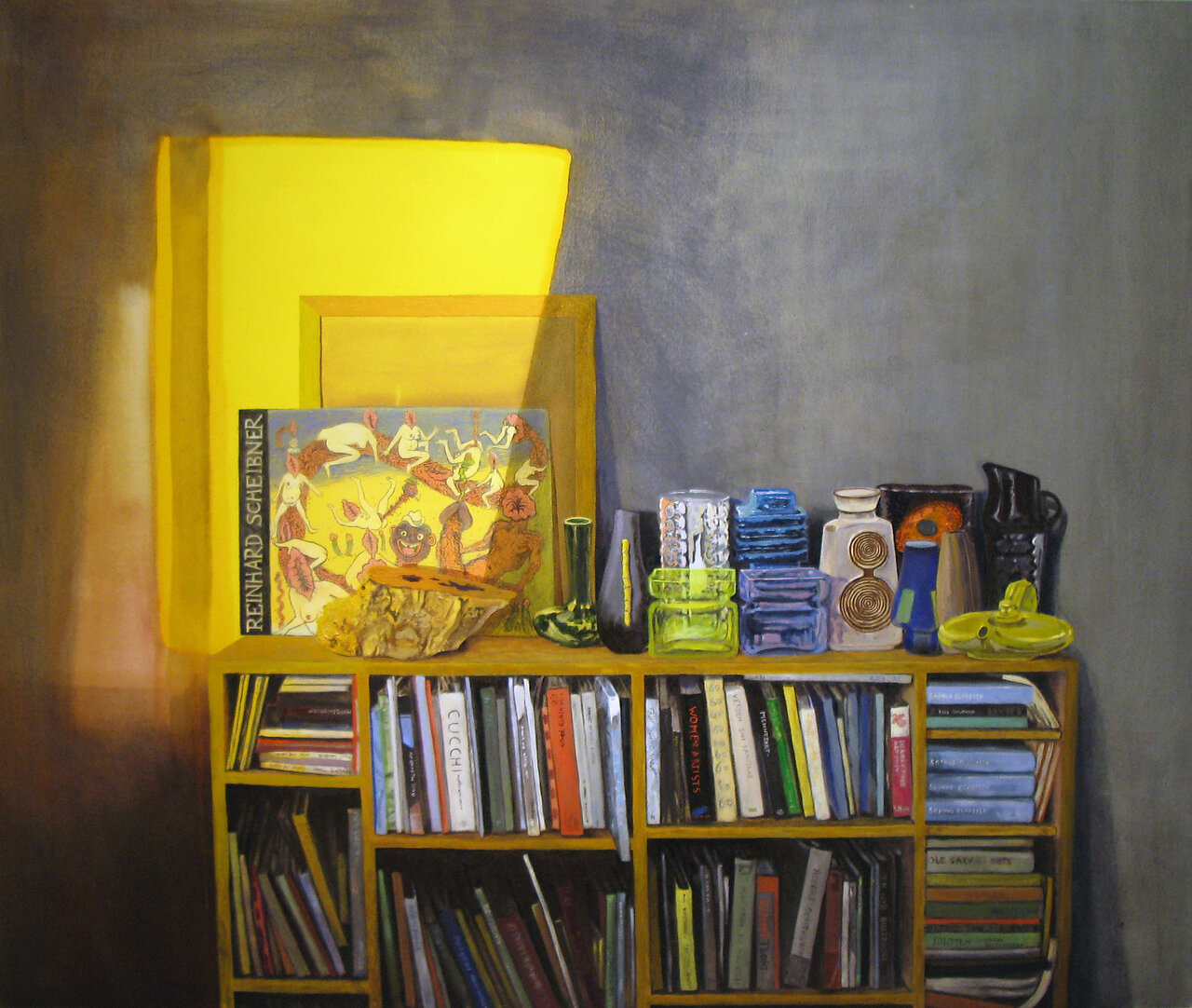 'Interiør med vaser og bøger'