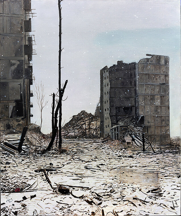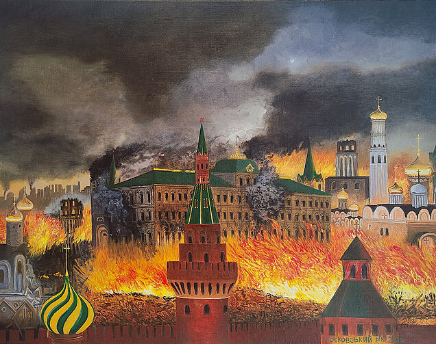 ’Moskva brænder 2030’, 2025 - efter ukrainsk børnetegning Olie på lærred 70x90 cm